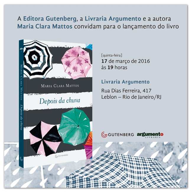 Na quinta-feira, dia 17, na Livraria Argumento, a Editora Gutenberg promoverá o lançamento do livro Depois da Chuva da autora Maria Clara Mattos. Participem!