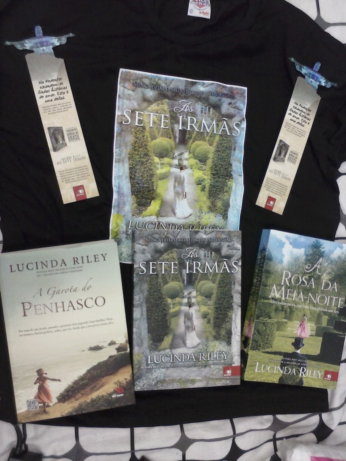 Quem foi ao evento acabou ganhando da editora uma camiseta preta com a capa do novo livro da Lucinda, assim como marcadores com o desenho do Cristo Redentor. Para quem não sabe, este livro tem seu enredo desenvolvido no Rio de Janeiro. Cidade aliás que a autora passou um tempo para aprender os costumes e fazer sua pesquisa. Ele é o primeiro de uma série sobre 7 irmãs.